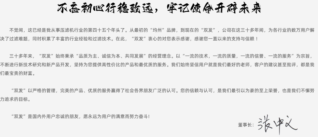 “濾污水為清泉,變污泥為凈土,還廢礦渣為青山綠地”,誠信塑品牌,質(zhì)量出名牌。三十多年來,“雙發(fā)”始終秉承“品質(zhì)為主、誠信為本、共同發(fā)展”的經(jīng)營理念。以“一流的技術(shù),一流的質(zhì)量,一流的信譽、一流的服務(wù)”為宗旨。不斷進行新技術(shù)研究和新產(chǎn)品開發(fā),堅持為用戶提供高性價比的產(chǎn)品和最優(yōu)質(zhì)的服務(wù)。
